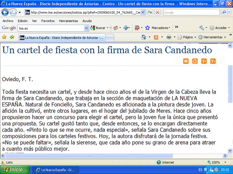 - La Nueva España. Un Cartel de Fiesta con la firma de Sara Candanedo para las Fiestas de la Virgen de la Cabeza de Meres, Asturias. [Leer +]
