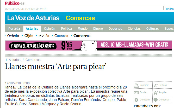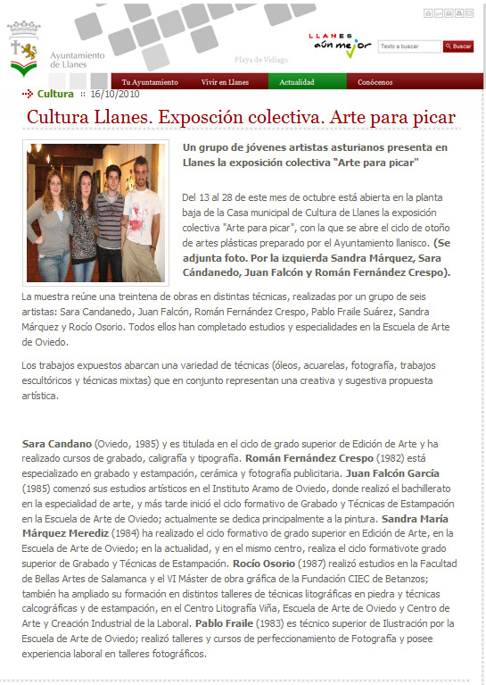 - 19/10/2009. La Nueva España.es. La Exposicion colectiva "Arte para picar" hasta el dia 28 en la Casa de la Cultura de Llanes. [Leer +]