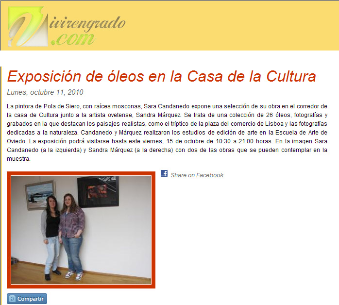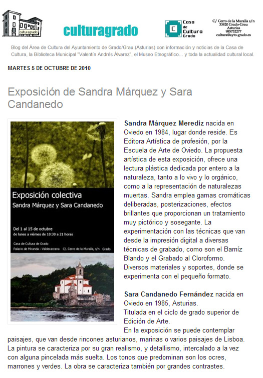 - 5/10/2010. Culturagrado. Blog del Area de Cultura del Ayto. de Grado. Las artistas Sandra Marquez y Sara Candanedo inauguran Exposicion Colectiva en la Casa de la Cultura del Ayto. de Grado. [Leer +]