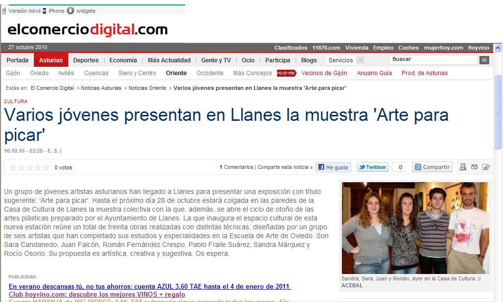 - 16/10/2009. El Comercio Digital. Varios jovenes presentan en Llanes la Muestra "Arte para picar". [Leer +]