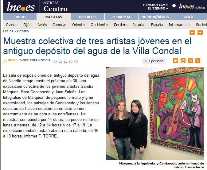 - La Nueva España.es. Muestra Colectiva de tres artistas jovenes (Sandra Marquez, Sara Candanedo y Juan Falcon) en el Antiguo Deposito del agua de la Villa Condal (Noreña). [Leer +]