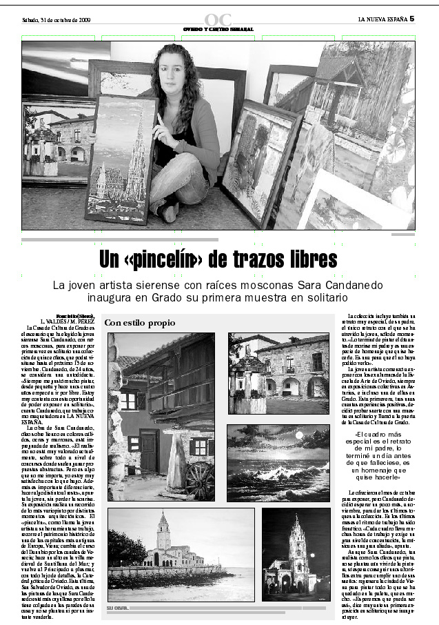 - 31/10/2009. Oviedo y Centro, Suplemento cultural de la Nueva España. La artista Sara Candanedo inaugura en Grado su primera muestra individual de óleos realistas.